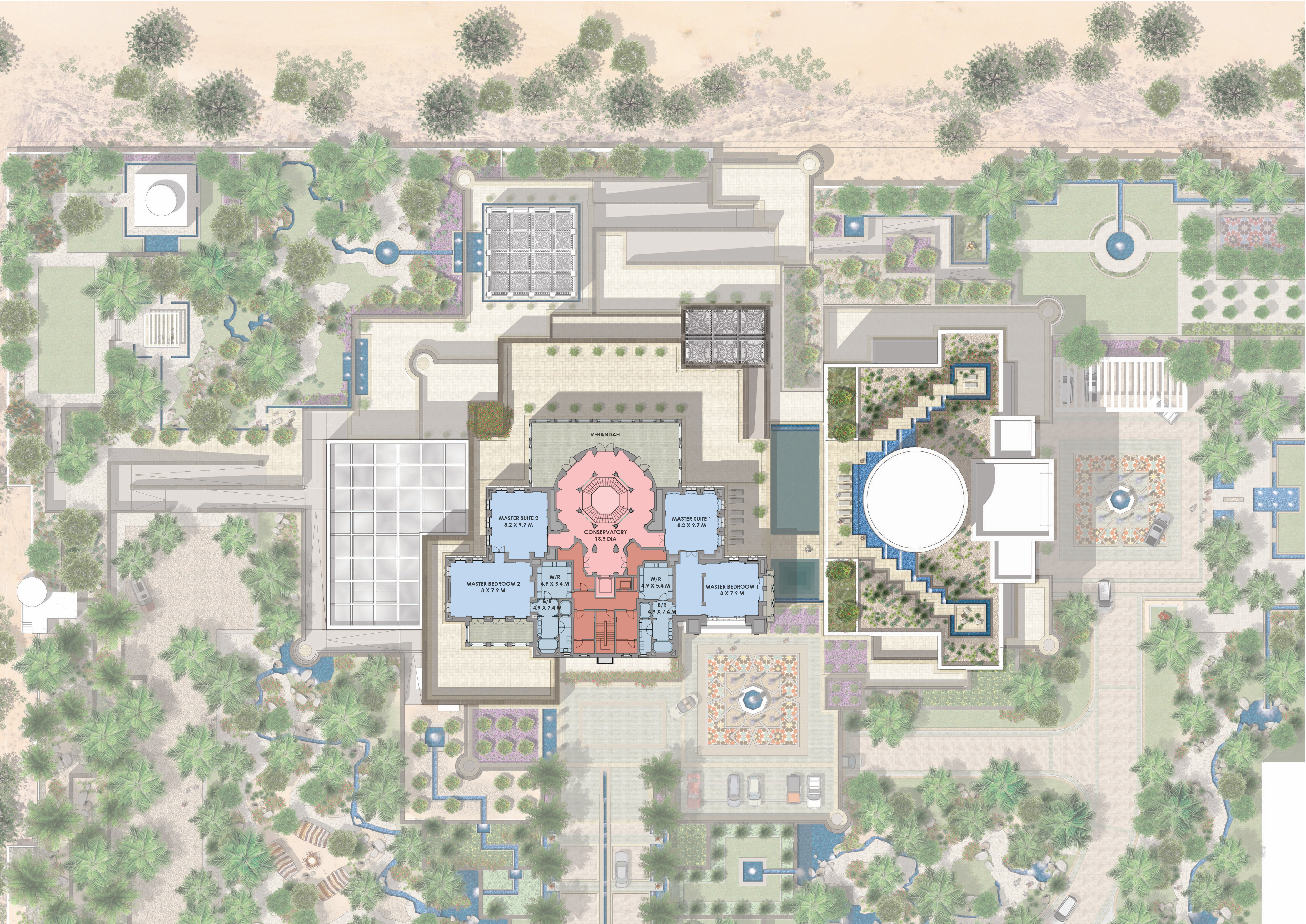 Project Brief: This is a vacation home for the Royalty. The residential complex consists of a main villa, and seven guest villas, by the side of Al Azaiba beach.