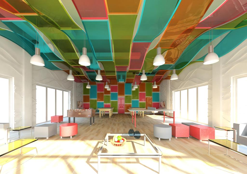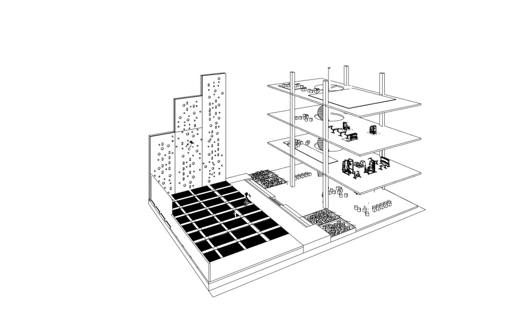 Style: The envelope around the existing structure is proposed to be made of steel frames with coloured acrylic panels at various intervals. The envelope is open in many areas to allow wind to come into the building. The arrangement of the panels also create a playful effect with lights and shadows.