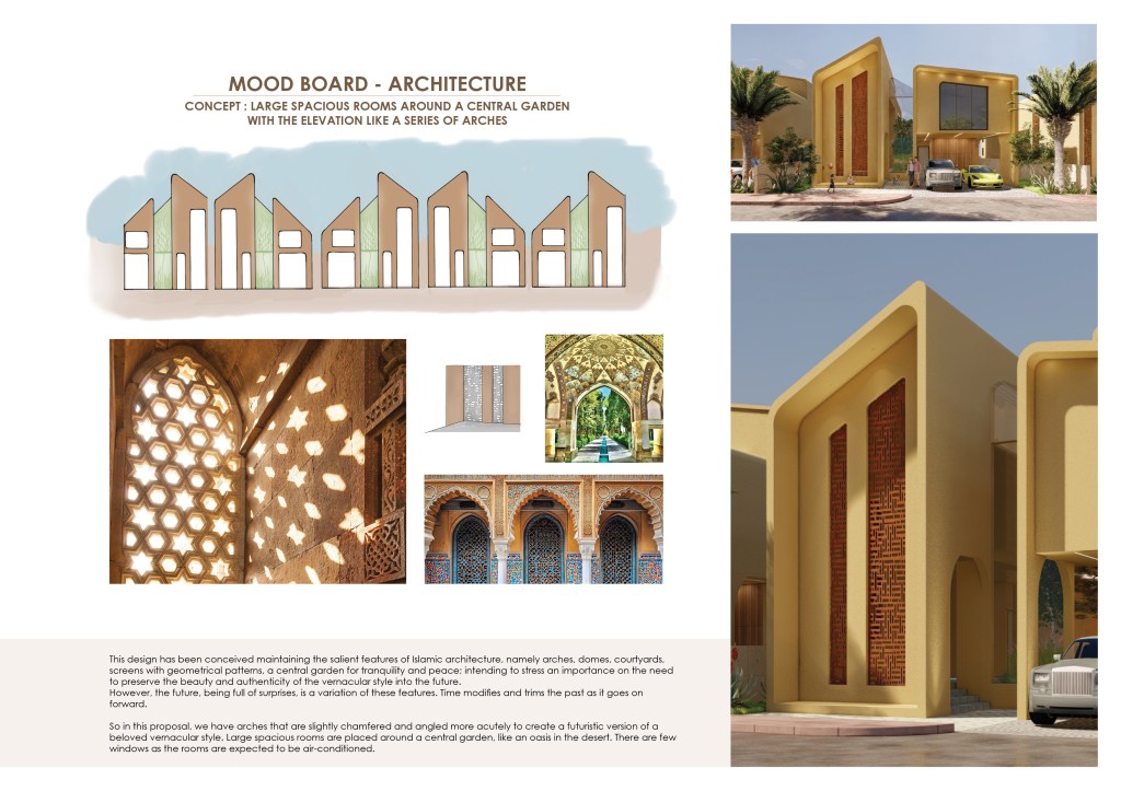 Style: A blend of modern minimalism and classical Islamic architecture,with a geometrically balanced form, and a calm white colour palette.The house is by the side of the beach and the White House is designed to complement the brown sands and blue sky.