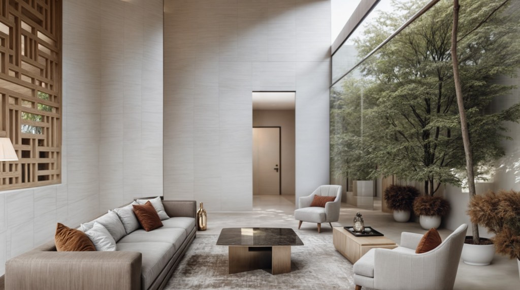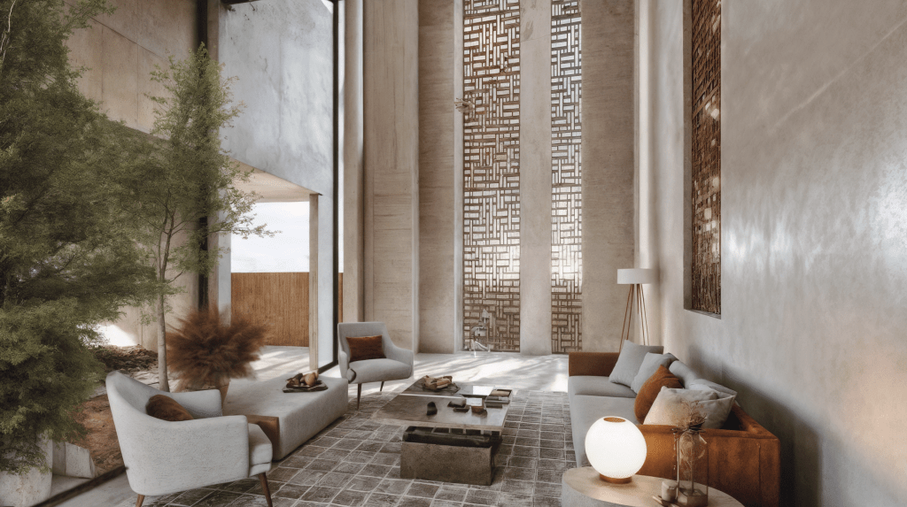 Style: A blend of modern architecture with metal screens with geometric patterns influenced by Islamic Architecture